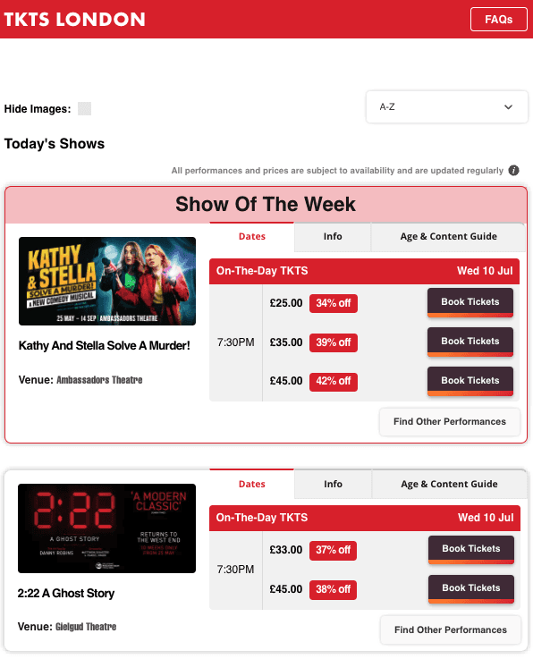Established in 1980 at the west side of Leicester square, named ‘the half price booth’, subsequently spawned many imitations. In 2001 it was renamed TKTS after it’s New York counterpart.