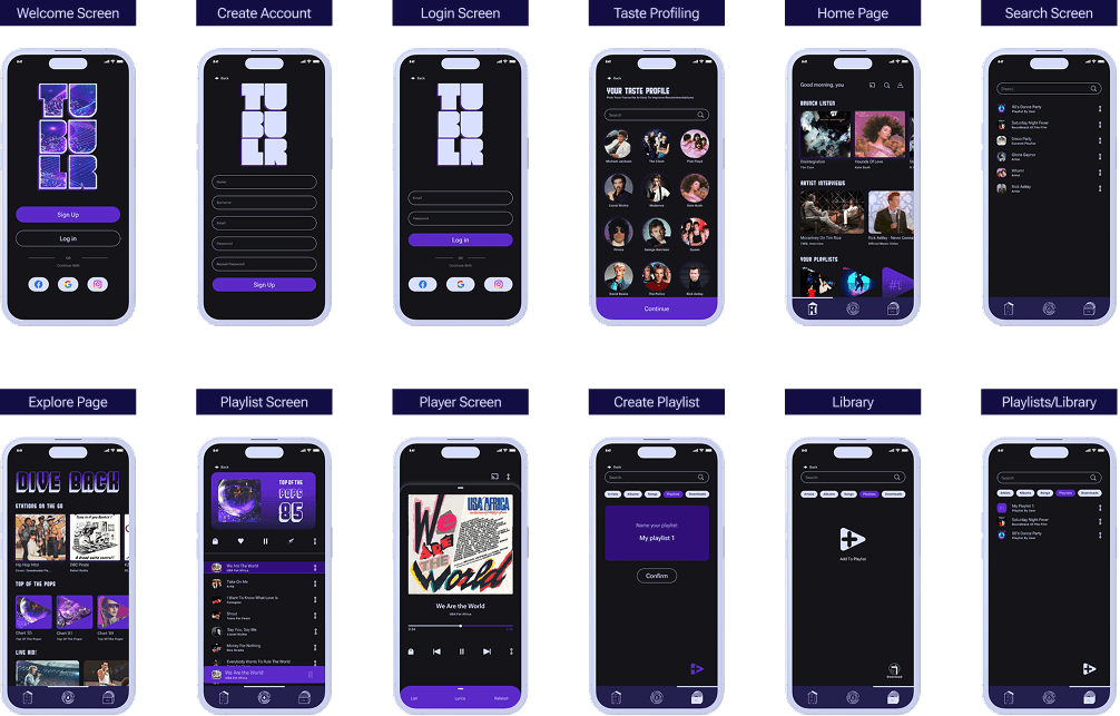 TUBULR seamlessly blends modern design principles of current music streaming apps with the aesthetic of the 80’s era.